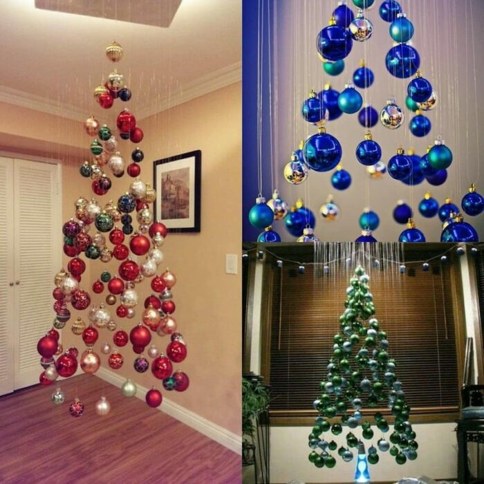 Para os mais ousados, a dica é apostar em uma árvore suspensa. Essa talvez seja mais difícil de se reproduzir em casa, mas nada que um Google não resolva, não é mesmo? Você pode tanto optar por pendurar apenas os ornamentos, como criar uma estrutura do zero, assim como mostra a segunda foto.
