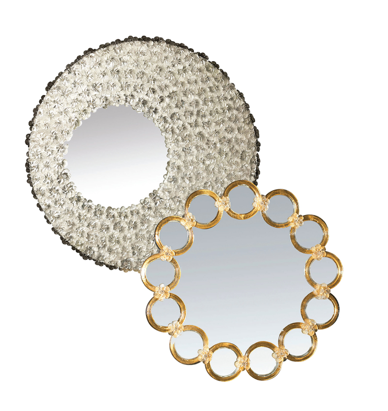 Nesta peça, as flores cintilantes em vidro transparente dão uma sensação de brilho elegante e prateado. Já os anéis dourados de vidro de Murano formam a armação do gracioso espelho redondo também da Ongaro e Fuga. A decoração é soldada ao painel de base de madeira graças às detalhadas flores de vidro que unem cada um dos anéis, dando uma sensação de tradicionalidade em um design bastante