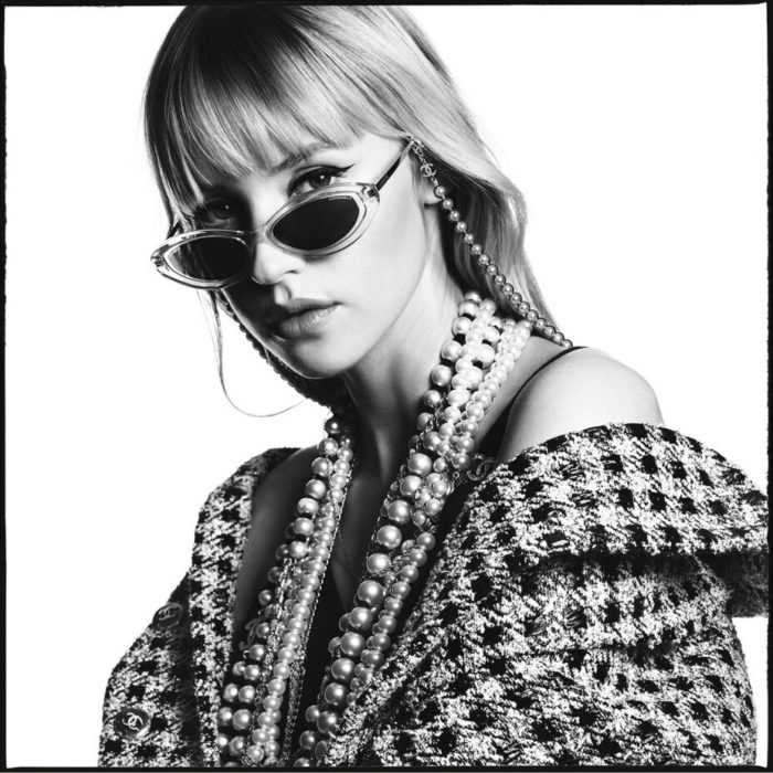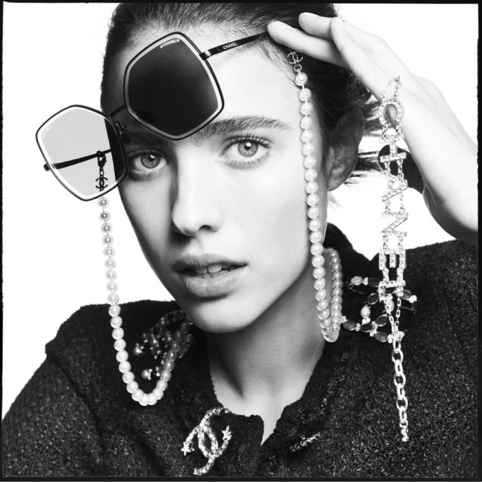 Cada par de óculos de sol foi feito para destacar a personalidade da celebridade que o exibe e que tem alguma história para contar com a casa francesa. Margaret Qualley, que usou Chanel no Globo de Ouro e no Screen Actors Guild Awards, foi de aro em formato de borboleta com corrente de pérolas brancas. Pharrell, embaixador de longa data da Chanel, usa um modelo preto adornado com finas placas de metal gravadas no estilo tweed da marca.