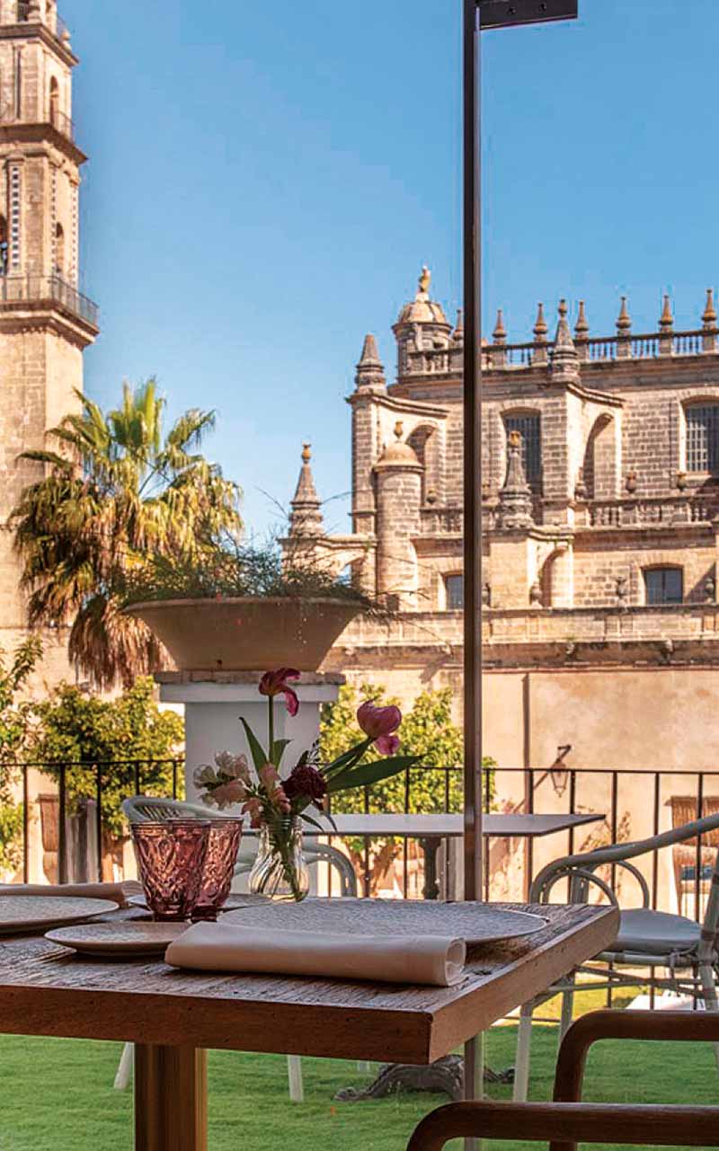 Para os que não resistem a uma boa mesa, o Pedro Nolasco, restaurante dentro da bodega, é um capítulo à parte. Recomendado pelo Guía Repsol 2024, oferece uma cozinha tradicional jerezana com alma contemporânea. É o lugar para provar um “Tío Pepe en Rama” pareado com uma vieira caramelizada ou um Amontillado de 1975 acompanhado por rabo de touro cozido lentamente. Ou, simplesmente, deixar-se levar por sabores que parecem saídos de um livro de García Lorca. A decoração é inspirada na vindima, os tons são neutros e elegantes, e o ambiente tem aquele charme relaxado que só o sul da Espanha oferece. Ao fundo, a catedral observa, silenciosa.