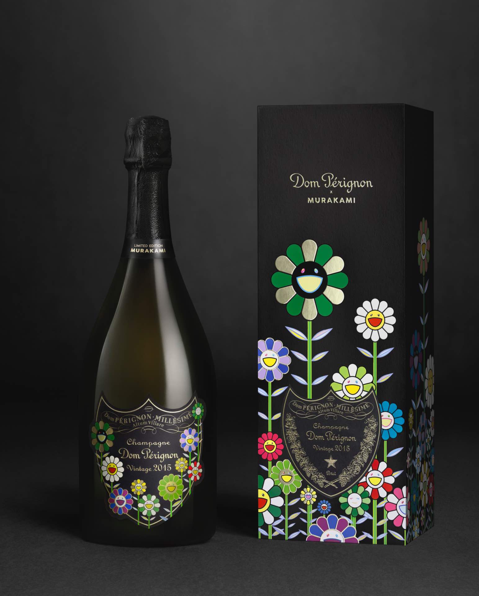 Nas edições limitadas da Dom Pérignon, as flores sorridentes ganham destaque ao envolver coffrets e garrafas em tons escuros, estabelecendo um diálogo entre o universo pop do artista e a sofisticação atemporal da Maison. No lugar da tradicional vinha do escudo da marca, surge uma paisagem de flores vibrantes. No Brasil, apenas 100 garrafas da edição Dom Pérignon x Takashi Murakami Vintage 2015 estarão disponíveis, com preços entre R$ 2.400 e R$ 2.600.