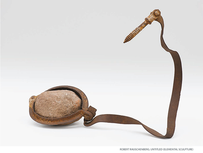 Em 1959, Robert Rauschenberg (1925-2008) escreveu que “a pintura se relaciona tanto com a arte quanto com a vida. Nenhuma das duas pode ser feita. Eu tento agir na lacuna entre as duas”. Seu trabalho nessa lacuna definiu a prática artística para os anos seguintes. O início dos anos 1950, quando Rauschenberg lançou sua carreira, era o apogeu da pintura gestual heroica do Expressionismo Abstrato. Rauschenberg desafiou essa tradição artística com uma abordagem igualitária a materiais, trazendo as coisas do mundo diário para a sua arte.