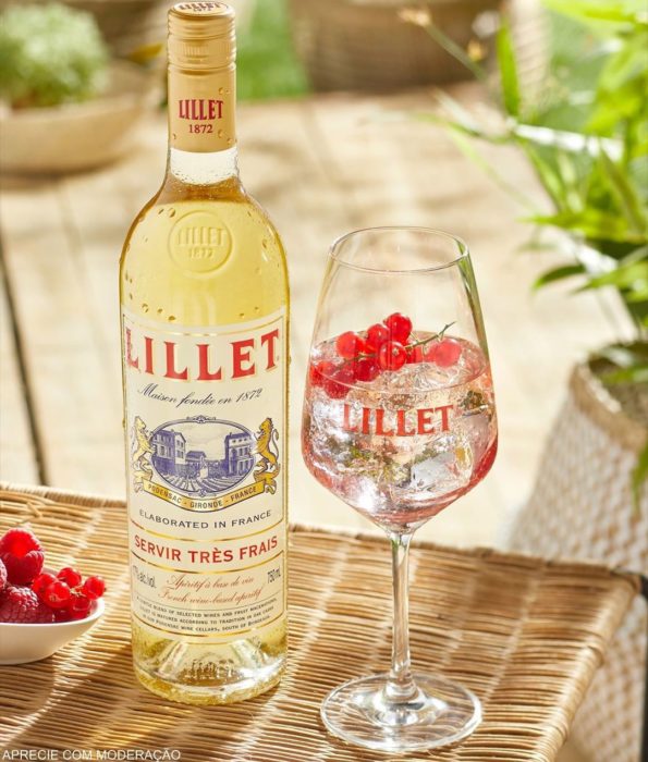 O aperitivo Lillet (vinho aromatizado com licor de frutas) + rodela de limão + gelo + espumante