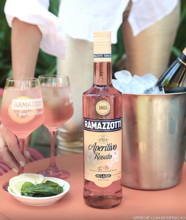 O Aperitivo Rosato Ramazzotti (à base de hibisco e flor de laranjeira) + gelo + espumante