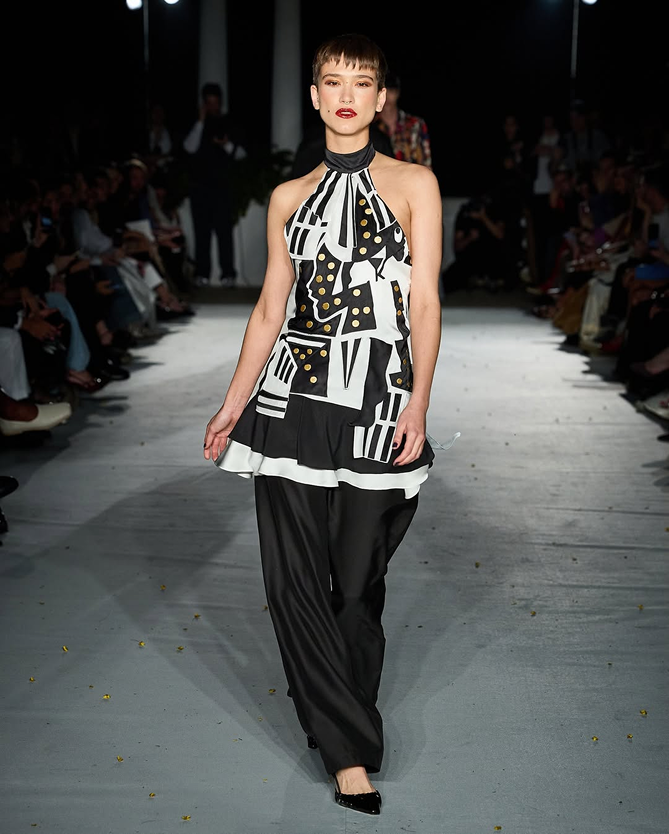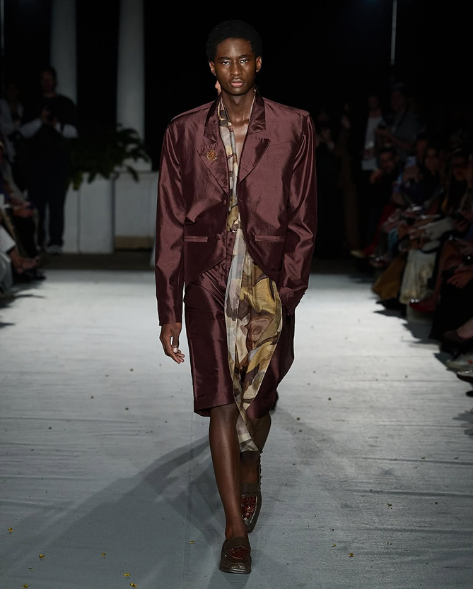 Em comunicado à imprensa, Namitala disse que o desfile é, ao mesmo tempo, lúdico e denso. A analogia conversa com as duas matérias-primas que conduziram a apresentação, couro e seda. Ambas deram forma a peças com silhueta inspirada nos anos 1970. E se teve uma coisa que aconteceu — e muito — nessa década, foram as festas regadas a prazer.