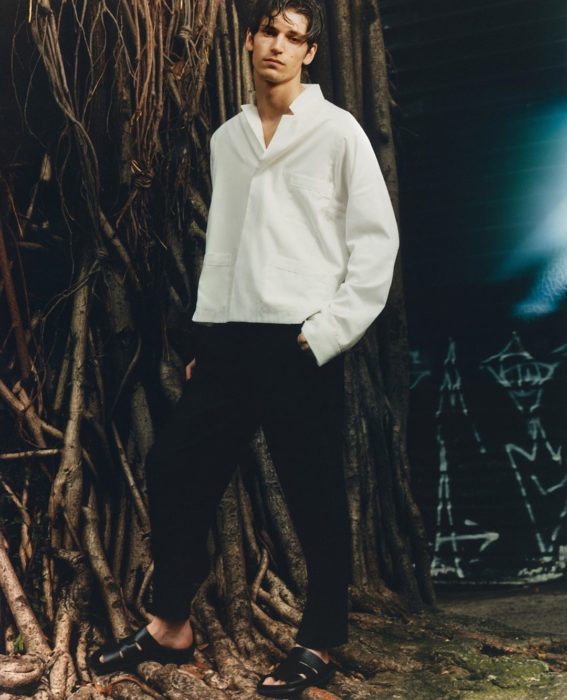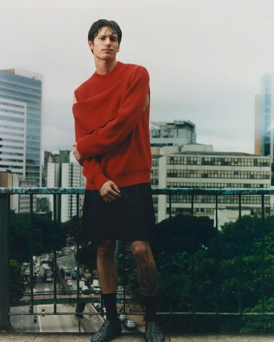 Quanto às peças, moletom desconstruído vermelho da Bottega Veneta, terno da Balenciaga, camisa oversized Jil Sander, e muito bermuda + botas. Confira o vídeo e fotos da campanha abaixo.