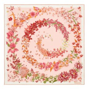 No coração da instalação, duas estampas da coleção Silk Pre-Fall 2026 apresentam diferentes leituras do universo floral da Ferragamo. Uma estampa explora o diálogo entre flores e silhuetas de sapatos, enquanto a outra cria uma composição em espiral com orquídeas, glicínias, lírios e dálias, em tons quentes e suaves, reforçando a sofisticação dos lenços de seda exclusivos e o cuidado com cada detalhe.