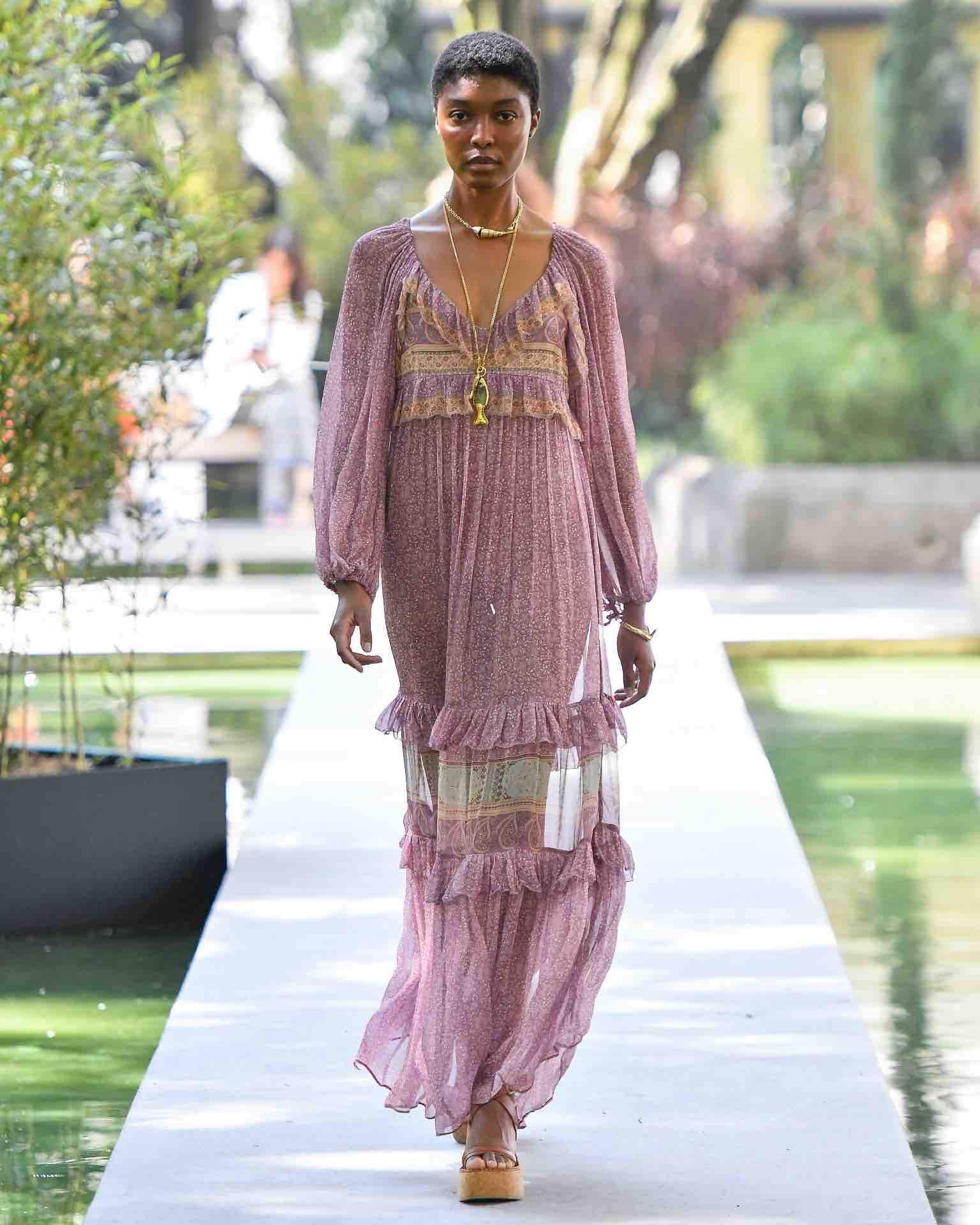 Lenços de seda amarrados nos quadris e nas cinturas, correntes douradas nos pescoços e chapéus de palha com circunferência exagerada criam looks com perfume de anos 70, como em uma fotografia de Ibiza, Búzios ou Saint-Tropez naquela época. A tentativa de dar um toque de modernidade (ainda que inspirada no passado), ou até sobriedade, é feita a partir dos óculos de grau aviador com armação dourada e da alfaiataria.