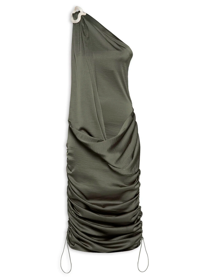“Para quem está começando, ter um espaço como esse faz diferença, não é só visibilidade. É uma estrutura para seguir criando”, complementa. O vestido assimétrico de ombro único reflete com o drapeado a ideia de deslocamento e força das águas. A paleta terrosa, verde, remete à junção de água e terra.