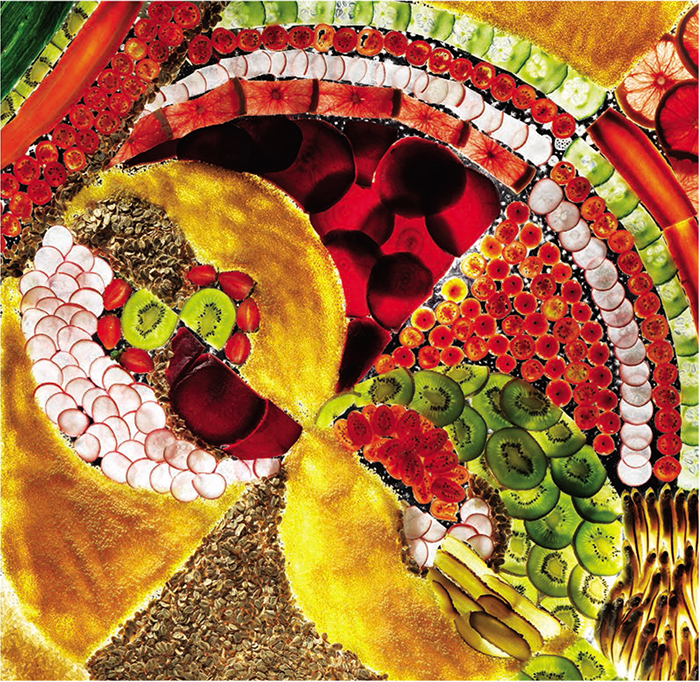 É como um polvo em movimento, que nos segura fortemente com seus tentáculos e destrói a biosfera. A justaposição do mesmo motivo tridimensional sobre impressões planas transcreve de novo essa impressão: as coisas parecem ser autônomas mas na verdade dependem uma das outras. Até quando a industrialização — o metal aqui — vai transformar as matérias-primas, culturas tradicionais, hábitos alimentares? A agroindústria da comida é dirigida pelo lucro, competitividade e produtividade, e infelizmente se esquece do essencial: o enorme desequilíbrio entre o consumo excessivo e uns e a desnutrição de outros.