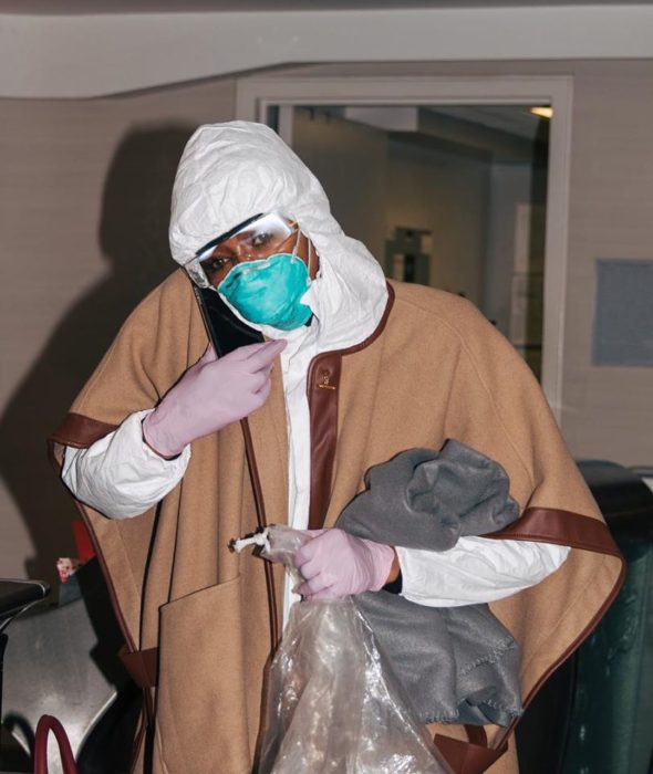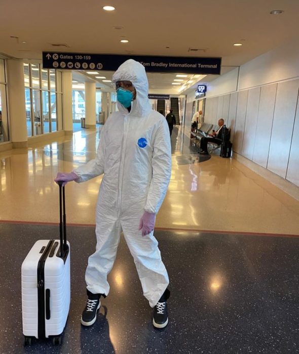 A proteção – aparentemente exagerada, mas quem somos nós para julgar? – reservou detalhes: um visual preto e branco que une tênis, macacão e mala de viagem (é preciso sustentar a fama de fashionista, afinal). Brincadeiras à parte, Los Angeles, que fica na Califórnia, é um dos estados mais atingidos pelo coronavírus nos EUA, país que já tem mais de mil casos confirmados.