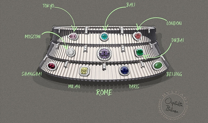 Para celebrar um momento tão importante, a Bvlgari criou uma peça de joalheria especial: a “The Bvlgari Ospitalità Italiana Necklace”, um colar de tubogás de ouro branco enriquecido com 10 pedras preciosas diferentes, combinadas cuidadosamente para representar cada um dos destinos de luxo da coleção Bvlgari Hotels & Resorts. Entre eles estão Milão, Londres, Bali, Pequim, Dubai e Xangai.