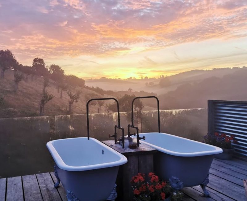 Um retiro nos campos, com duas banheiras vintage, ar livre e um pôr-do-sol fantástico – como não clicar?