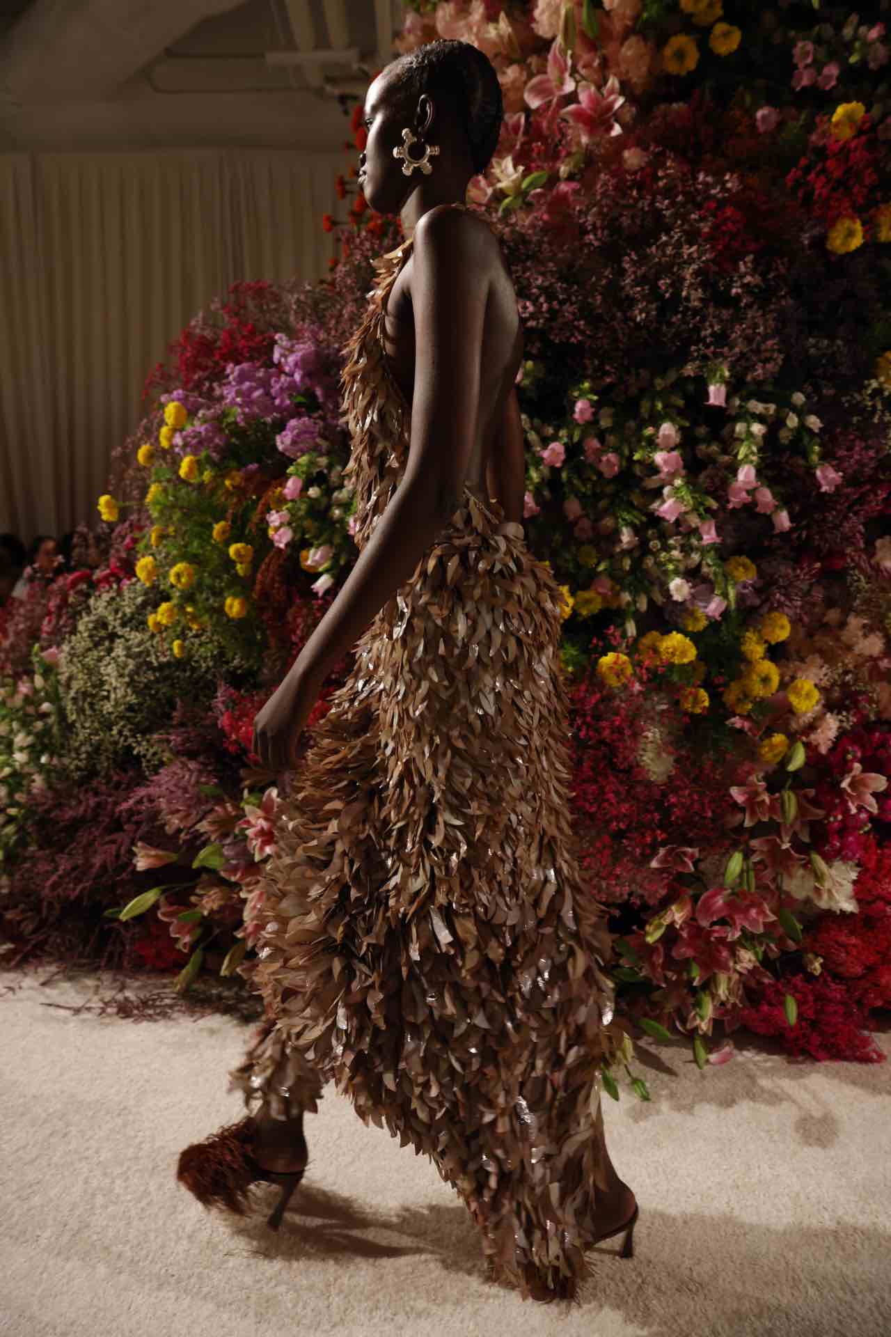 As modelagens são inspiradas nos anos 1980, com saias volumosas, franjas, babados e muitas curvas. Porém, a silhueta também surge mais rente ao corpo, com direito a transparências, recortes e franzidos. Tule, tafetá, jersey e rendas bordadas são estampadas ou lisas em tons terrosos, além de lavanda, rosa e amarelo amanteigado.