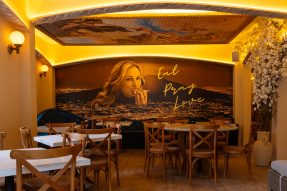 Painel no salão do restaurante faz referência à personagem Liz, de Julia Roberts, no filme Comer, Rezar e Amar