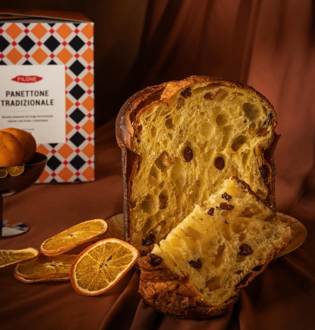 O produto da Filone segue uma leitura mais clássica da categoria, com massa leve, macia e bem identificável como panetone. A textura é molhadinha e o perfil puxa para o mais doce, embora leve laranja e limão cristalizados.
