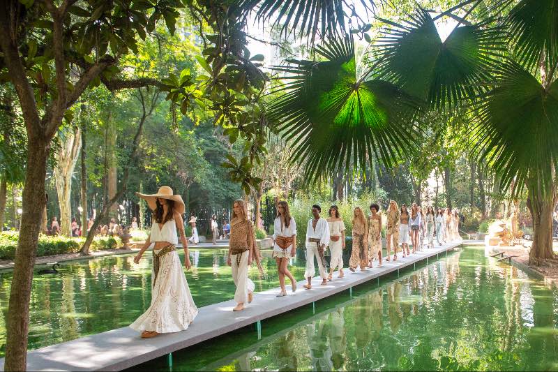 A coleção foi apresentada nos jardins do casarão do Iate Clube de Santos, em Higienópolis, com visual setentista e esvoaçante