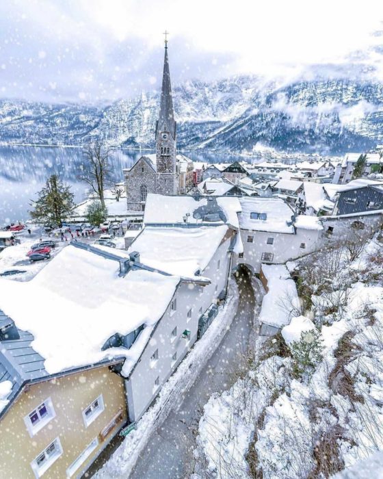 O vilarejo tem menos de 800 habitantes e fica aos pés de montanhas e um enorme lago, assim como na animação. A torre da igreja e até uma cascata de água (que aparece bastante no segundo filme) reforçam a semelhança com o cenário. Tudo fica ainda mais mágico durante o inverno, quando a neve e o lago congelado proporcionam uma experiência quase imersiva no filme.